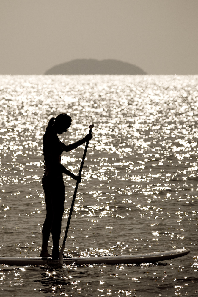 Rose is out on a SUP and I really want to capture an atmospheric image, straight into the sun with the water sparkling and Rose in shadow against the water, but with some detail coming out of the board at the bottom of the shot.