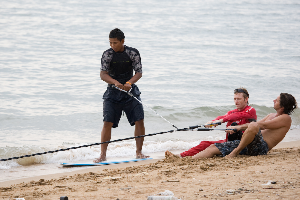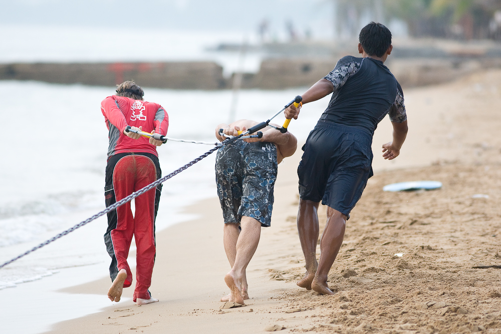 And one person runs with the surfer to help ease the launch: