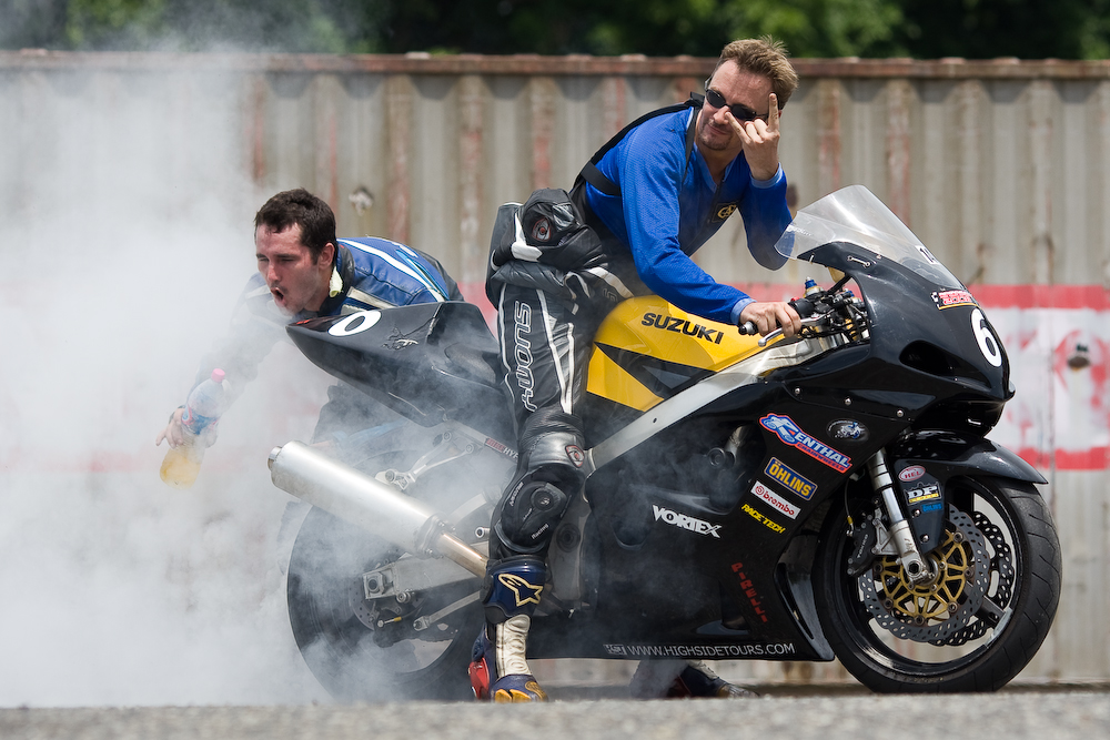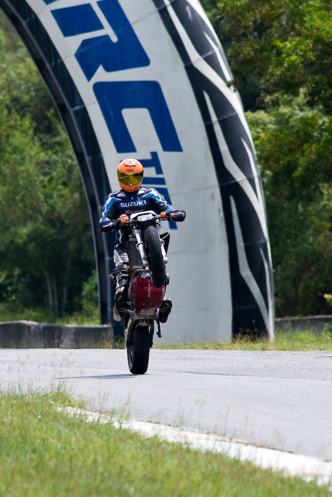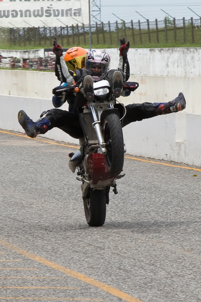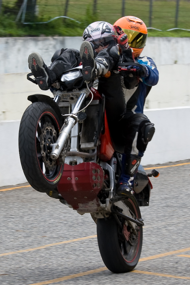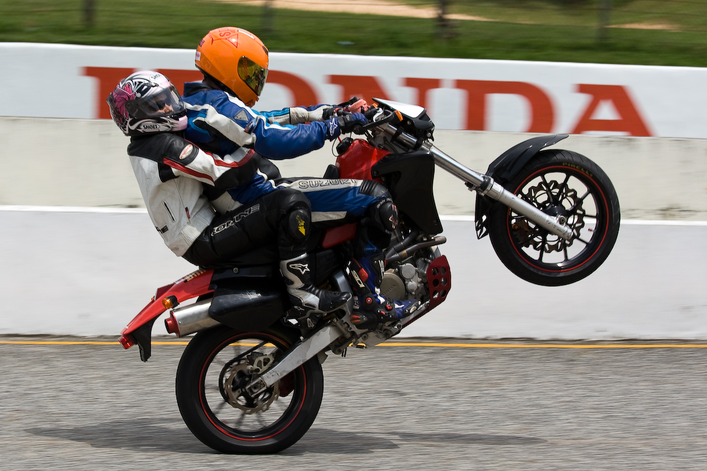 Next he enticed his long-suffering girlfriend to sit on the back while he did wheelies down the pit lane: