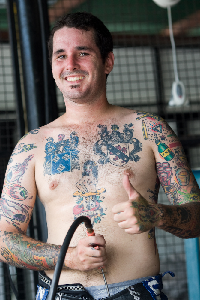 Adrenalin-sated from his wheelie adventures, he refreshed himself by inhaling tyre smoke: