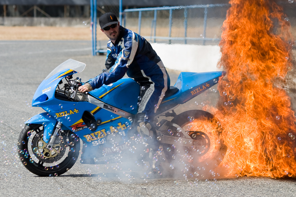 Luckily, yours truly came to the rescue. We had been walking past Toys R’ Us and they were demonstrating a bubble machine which looked cool and we were sure would delight the cats. It didn’t, they were terrified. So I took it down to the track in search of problem needing a solution, and voilà, a festive scene featuring a slightly mad Jimmy, a bike that is almost on fire, an out of control petrol fire; and bubbles!!
