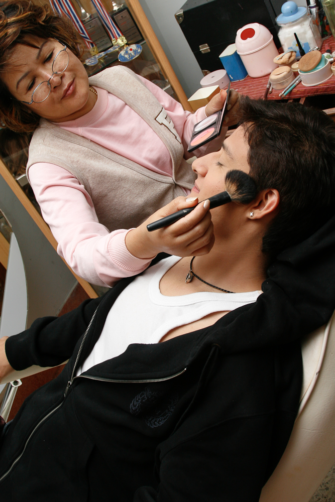 The makeup is applied by people whose skills would be better utilised as house painters. Layer after layer of caked crap is applied, until the victim appears mummified. Any change in expression results in a small avalanche of powder falling off the face, powdered leprosy.
