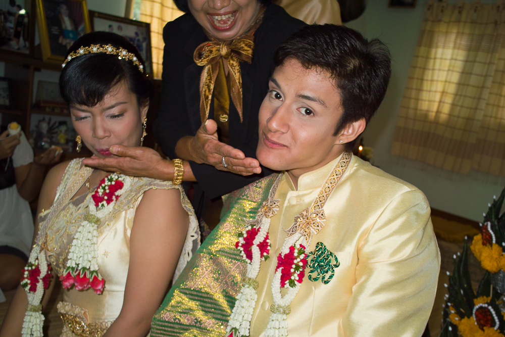 Then it is back to pick up the encrusted pair of lovebirds and a rush across town to get home before 0700 when the monks are due to arrive to start the ceremony. They finally roll up around 0815 and get down to some serious chanting.