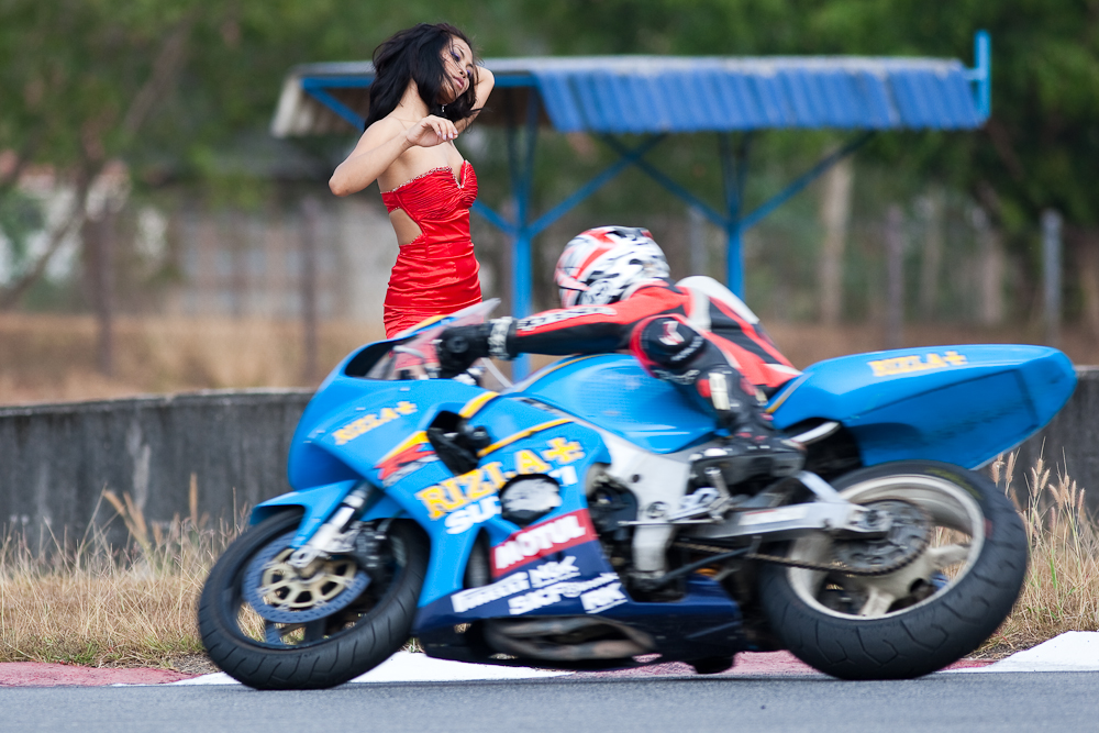 Another day at Bira shooting racing bikes, and the photogenic Khun Narin. We do the usual shots with her clambering next to trees: