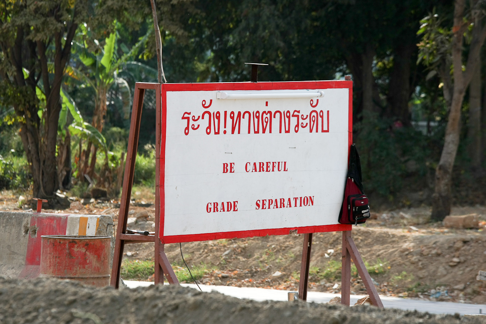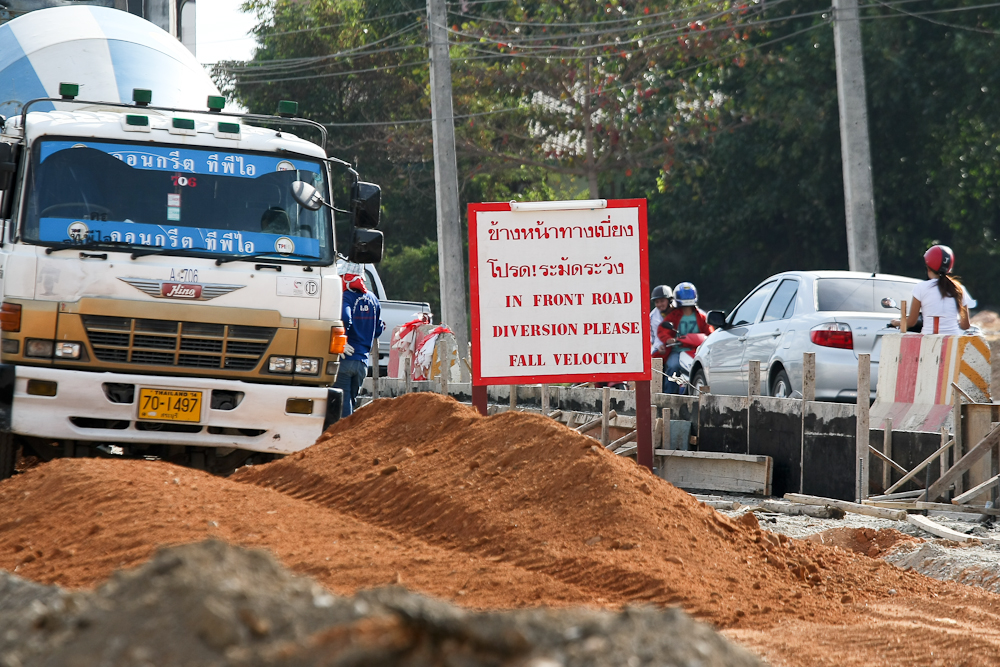 Having made motorists struggle through swampy, bumpy rubble for a year or so, the builders have suddenly erected some signs which are more likely to make you have an accident as you attempt to decipher them, rather than serve as a warning.