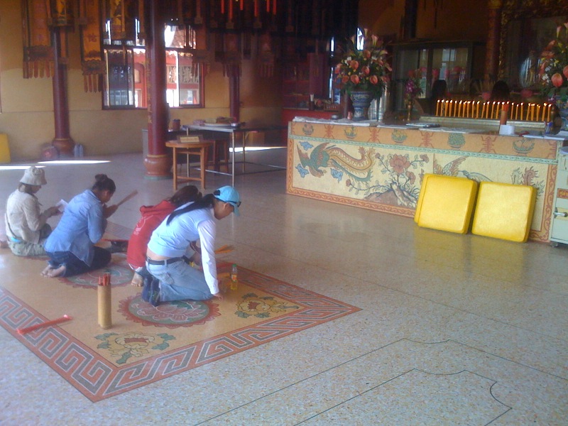 Then to a stall where, for 45 baht, you get a bag of joss sticks, a bottle of oil, and a couple of candles; all the necessary paraphernalia for making merit. Then upstairs to the temple area.