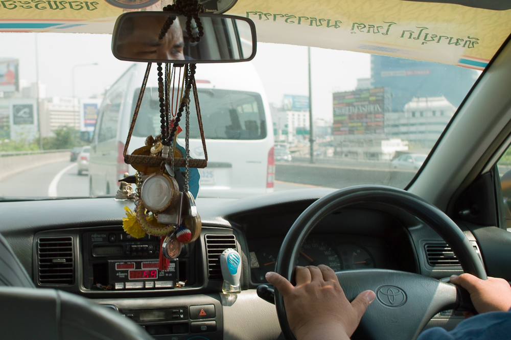 In the back of a particularly aggressive Bangkok taxi. The constant near misses were either due to incompetence, or to the fact he couldn’t see out of the window properly because of all the amulets which were ensuring that we wouldn’t drive into a tanker and evaporate in a fiery ball of death. And we didn’t, so they must work.