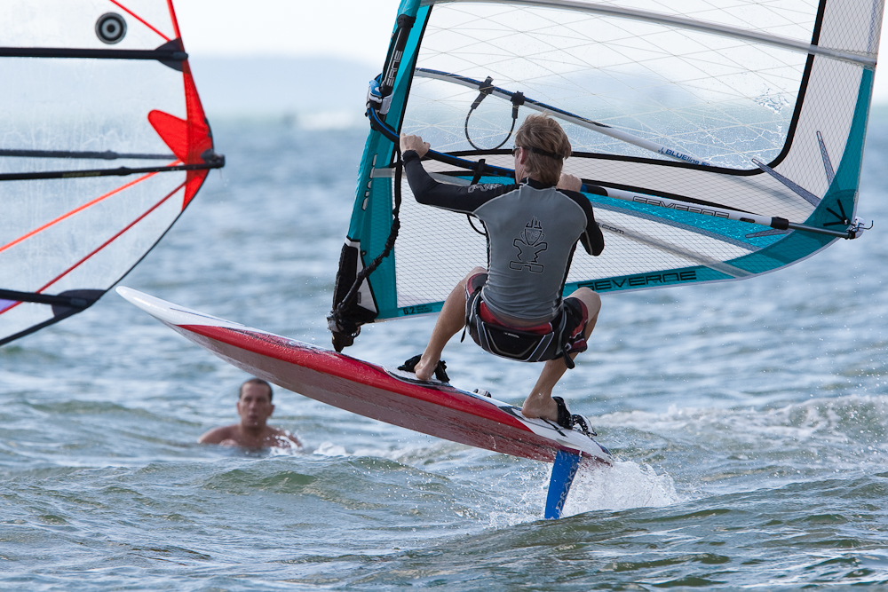 With the strong wind being well offshore, there were few chances, but Craig obliged by jumping his board just after leaving the beach, much to the consternation of a nearby swimmer.