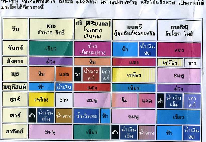 In case you are not fluent in the Thai script, I can tell you that the columns down the left represent the days of the week, the left hand colour column is a good colour to wear on that day, the right hand column is a no-go colour for that day, and the other two columns are… I don’t know.