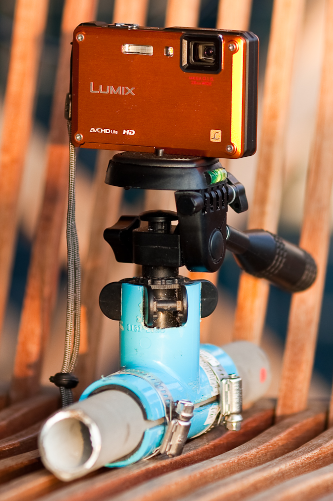 I know what you’re saying. “Come on Spike, you don’t fool us. Surely you used an top line design house, Porsche perhaps, to come up with the design?” But no, it’s all my own work. One piece of blue plumbing stuff (real purpose unknown), two clamps and one partially destroyed tripod. Pure genius.