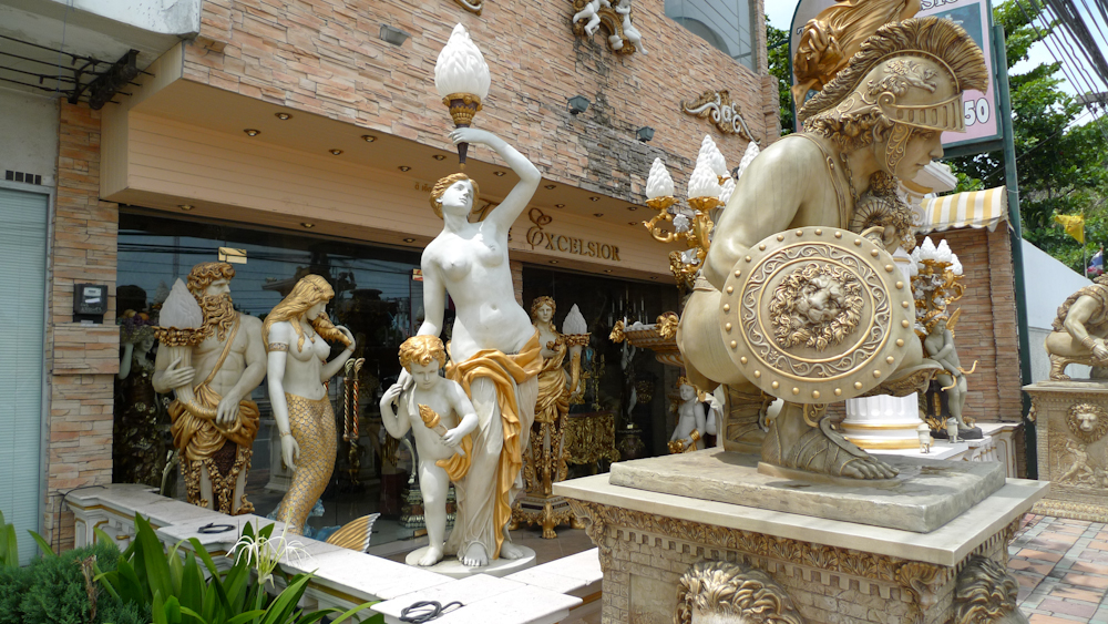 There is a segment of the population, and I suspect that it is Thai-Chinese, that has a penchant for glitzy, neoclassical, phoney bling; or to summarise: crap. Inside the house, big heavy chairs with ornate and badly finished embellishments and gold paint trimmings. Outside the house; well you need a selection of Roman and Greek statues, and this is the place to buy them: