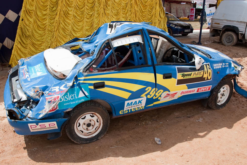 Inside the tent, the scrutineers were checking that the cars were road legal and had all the necessary safety bits, so that if anything happened, the crew had a chance of survival. Like this, where the occupants walked away from the crash: