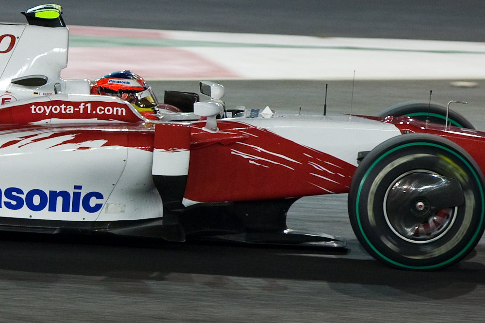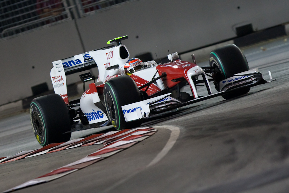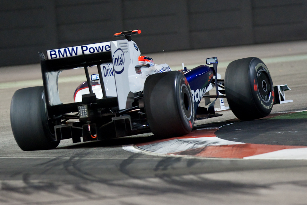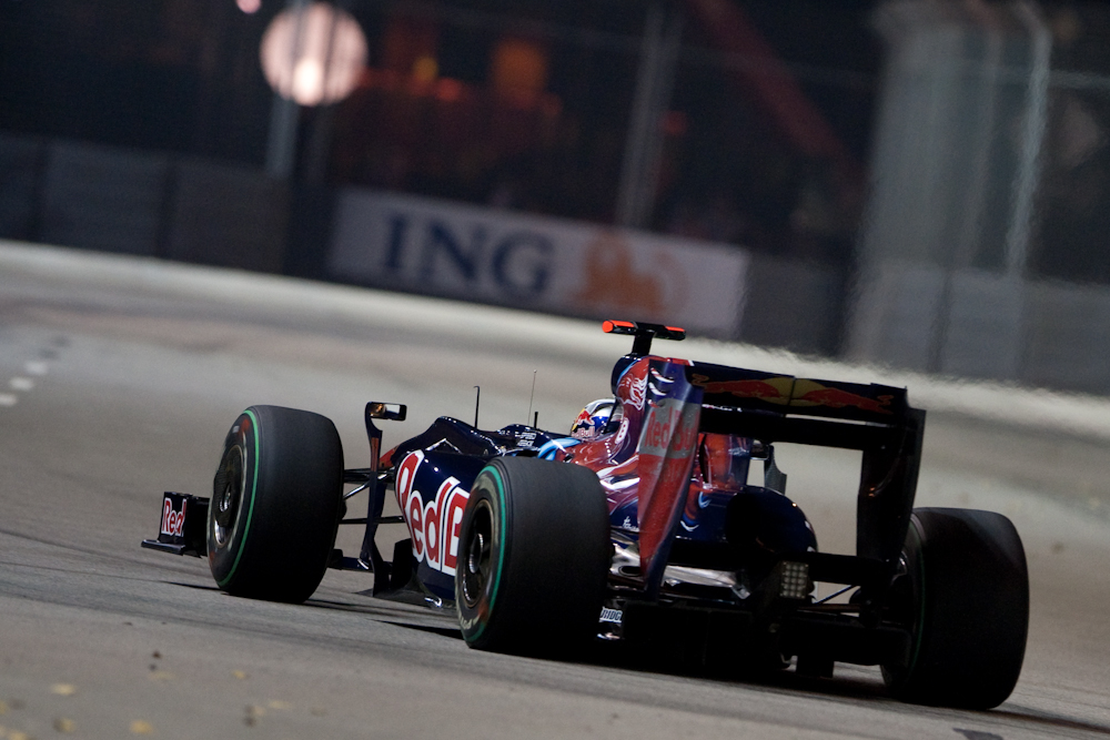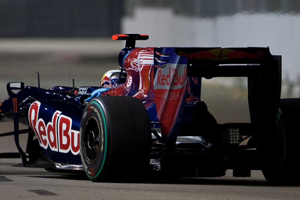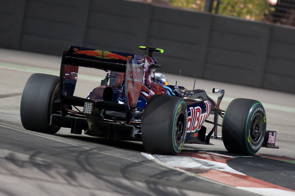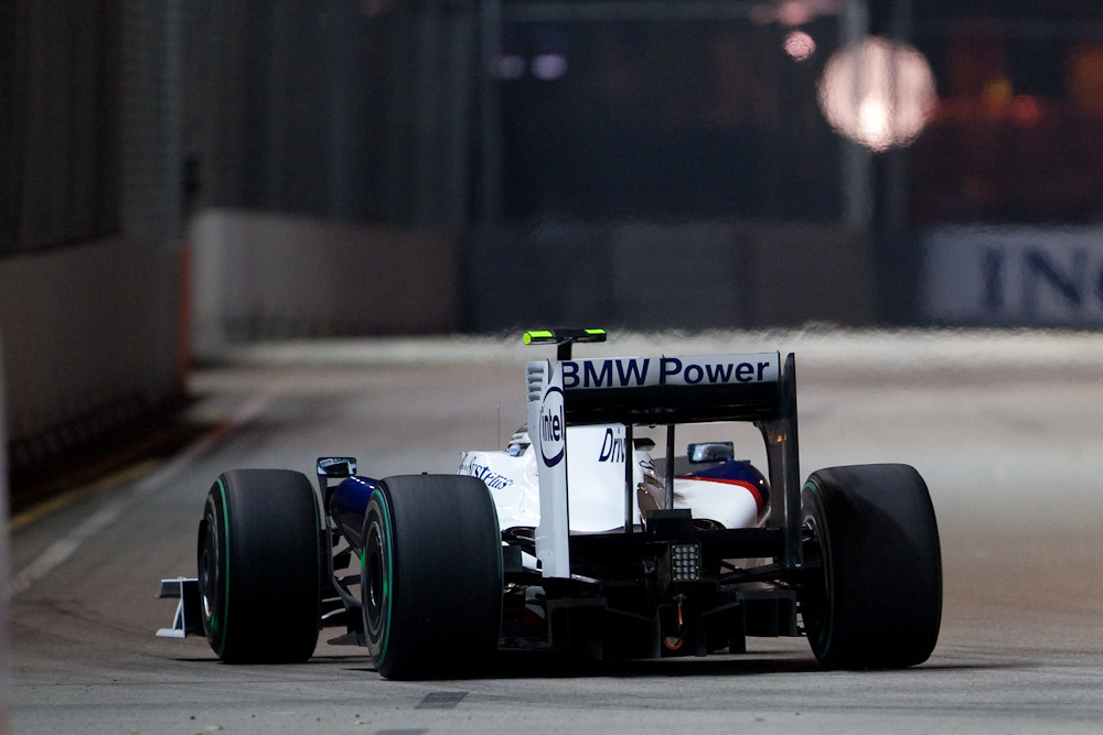 For this reason I decided not to take my serious camera to Singapore. I would take the LX3 for some general shots, and just take hand baggage with some spare clothes. Then I foolishly bought my friend in Singapore a condo warming present of a corkscrew; one of those monster corkscrews that could also be used for digging escape tunnels should you happen to be imprisoned. I then realised it would also be useful as a tool to intimidate airline pilots and that I would not be allowed to take it on the plane. Which meant I would have to check in my baggage. Which meant I would have nothing to hand carry. Which meant I decided I might as well carry my big camera after all. So I did; and once I arrived in Singapore we went straight to the track for the Friday evening practice which ran from 2130 to 2300. The track lighting provided enough illumination for the drivers, but not enough for photography without cranking up the ISO, but I got some reasonable shots. Here are some of them: