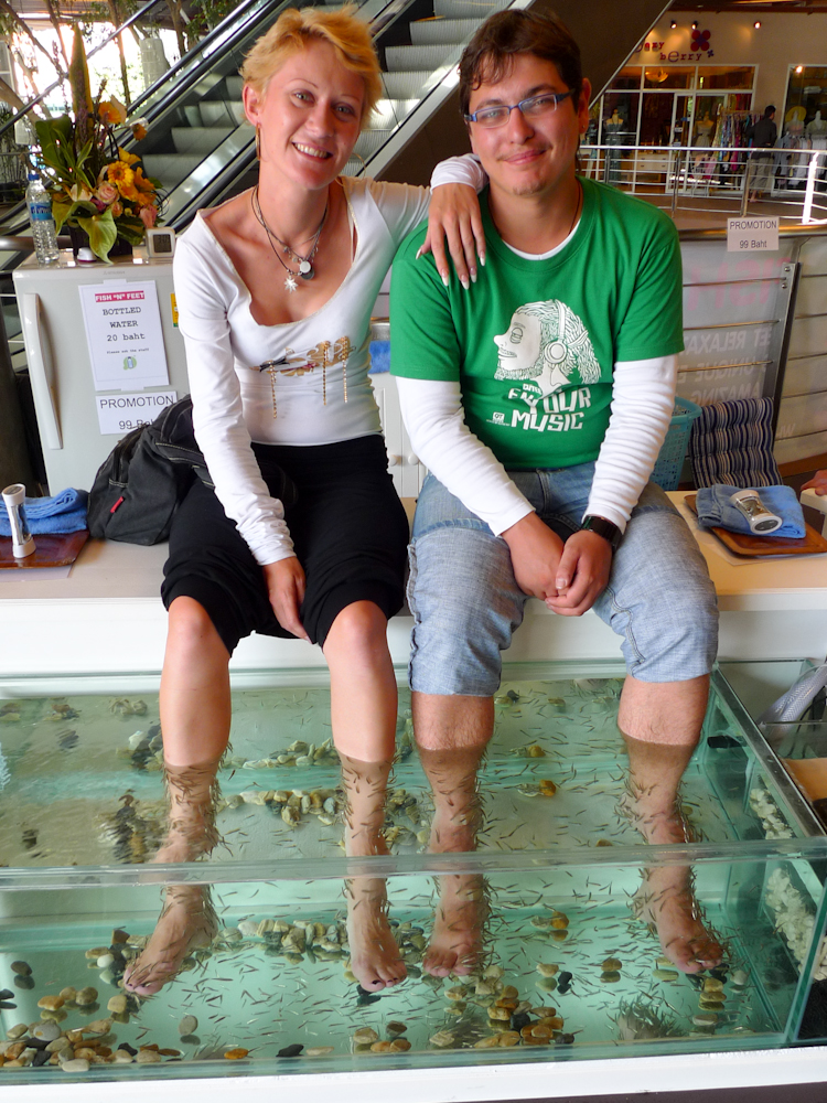 Here’s an attraction that is bound to boost the tourist arrivals over the coming months. It’s called Fish’N’Feet and the concept is simple. Stick your feet in a tank of fish and let them suck your flesh. The fish apparently enjoy sucking on dirty, sweaty feet; you apparently enjoy having you feet sucked, and the owner of the business pockets 90 baht. It’s symbiosis in action.