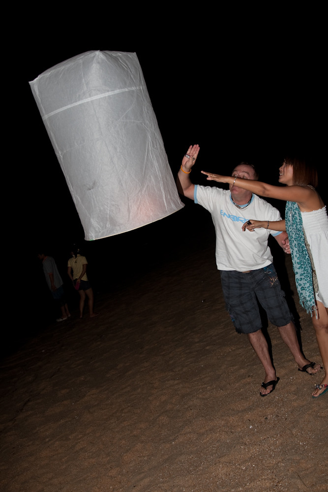 The Krathong is taken down to the edge of the sea and several minutes are spent swearing while trying to light the candle in the wind (no singing please). Then you launch the krathong into the waves, the candle goes out and the whole contraption either capsizes or is washed back to shore. It’s a poignant moment.