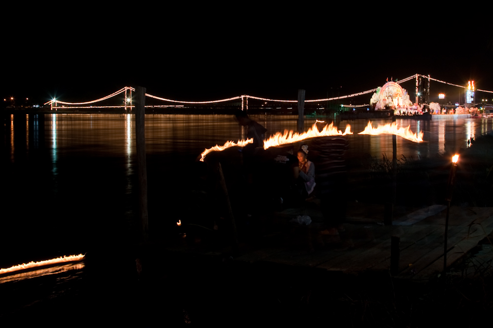Note: This is a 4 second exposure and the arc of fire is someone carrying a krathong to the water’s edge.