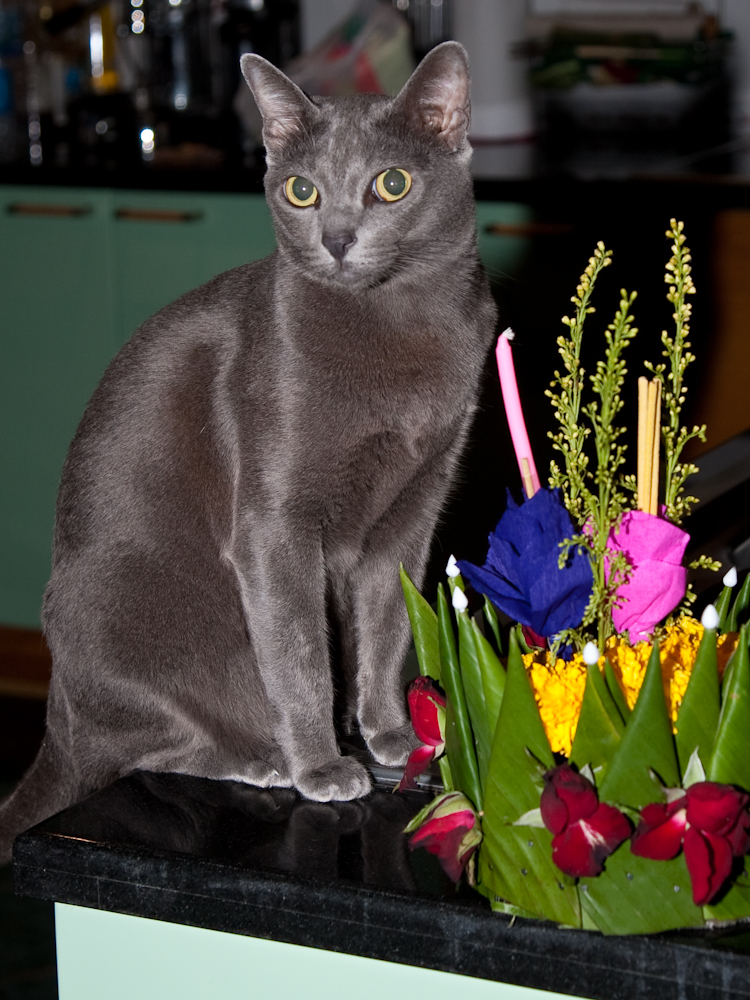 This is our Krathong, attracting the attention of Tiki who attempted to eat the candle immediately after the photo was taken. It was fashioned by hand, using all natural materials, by she who must be obeyed over a period of several hours. Or, we bought it on the street and the key ingredient is Styrofoam.