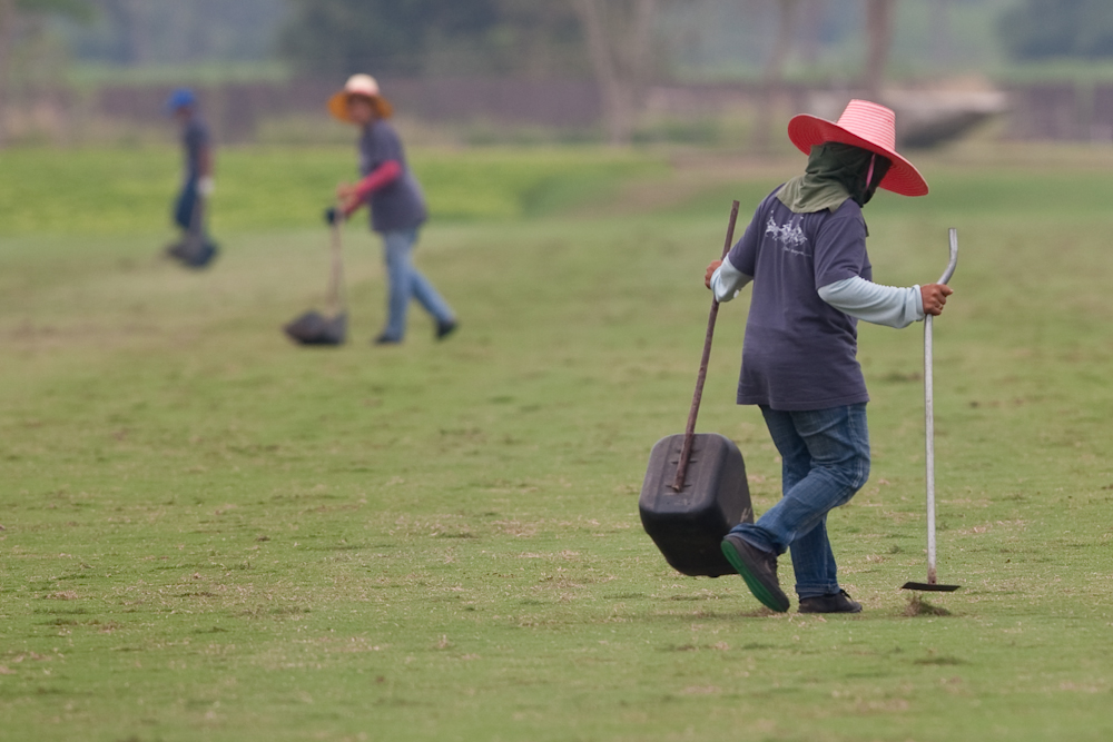 After every chukka a squad of ladies fans out to flattens the divots and scoop up the shit. Some degree of training is required for this task, because if you mix things up and flatten the shit and scoop up the divots, this would be detrimental to the quality of the grass.