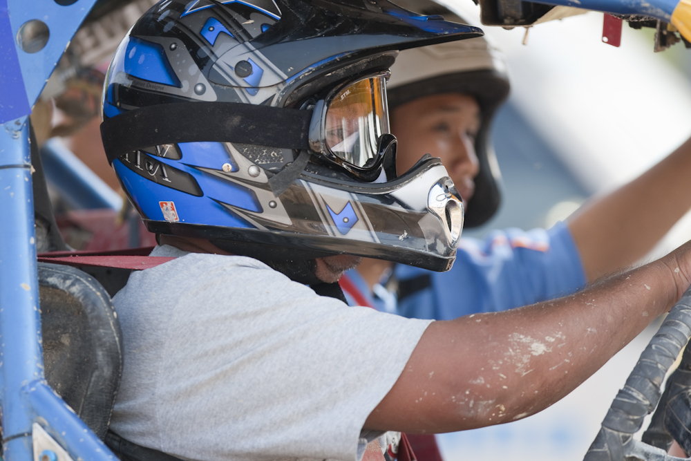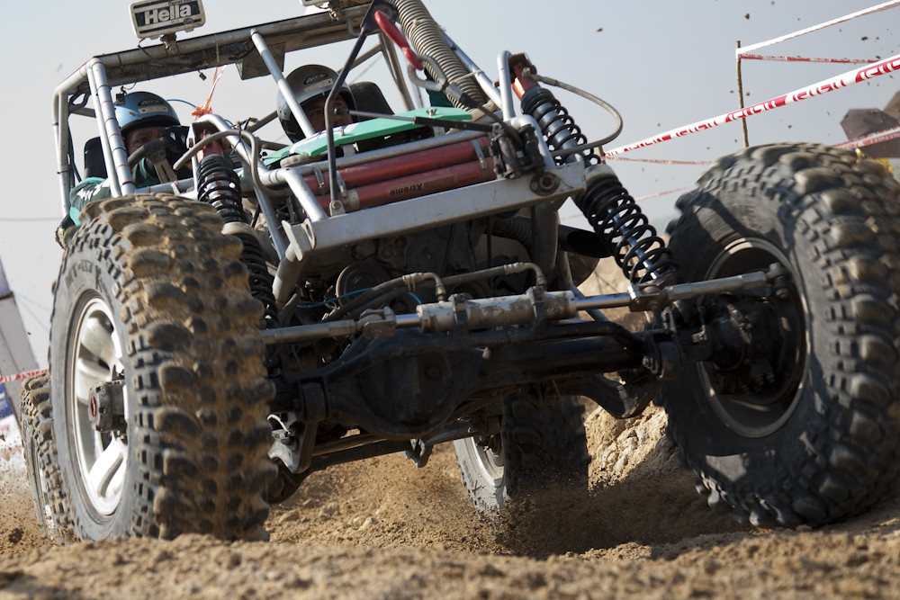 The buggies/jeeps ran two at a time on a track that had a crossing half way, so they both ran the same distance.