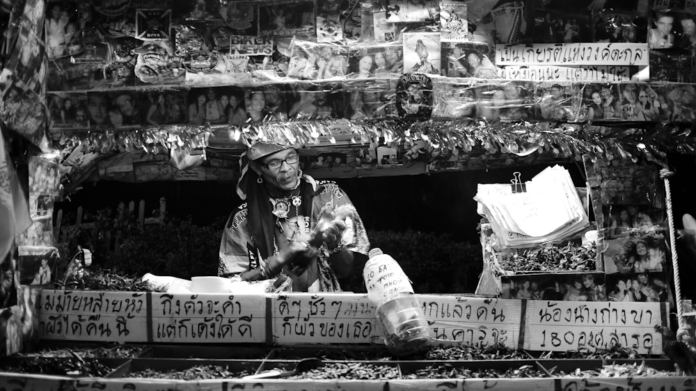 There is a man with a barrow full of fried insects who appears after dark. He announces his presence by playing the drums and then follows up with a performance on the spoons.
