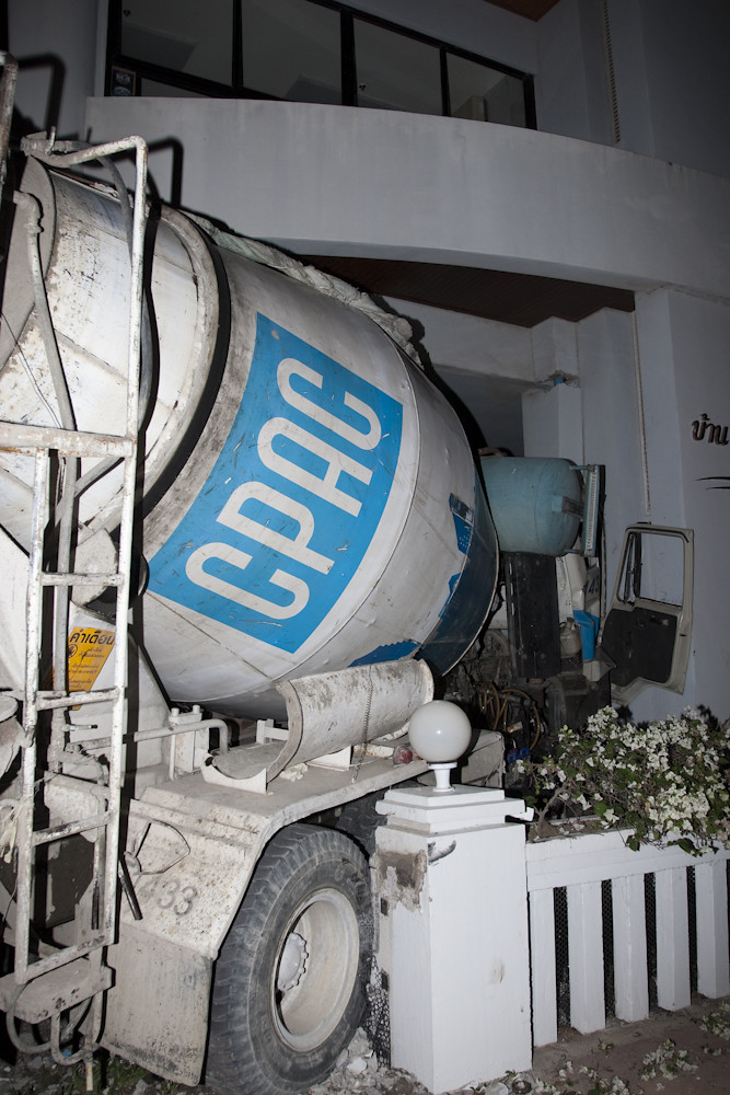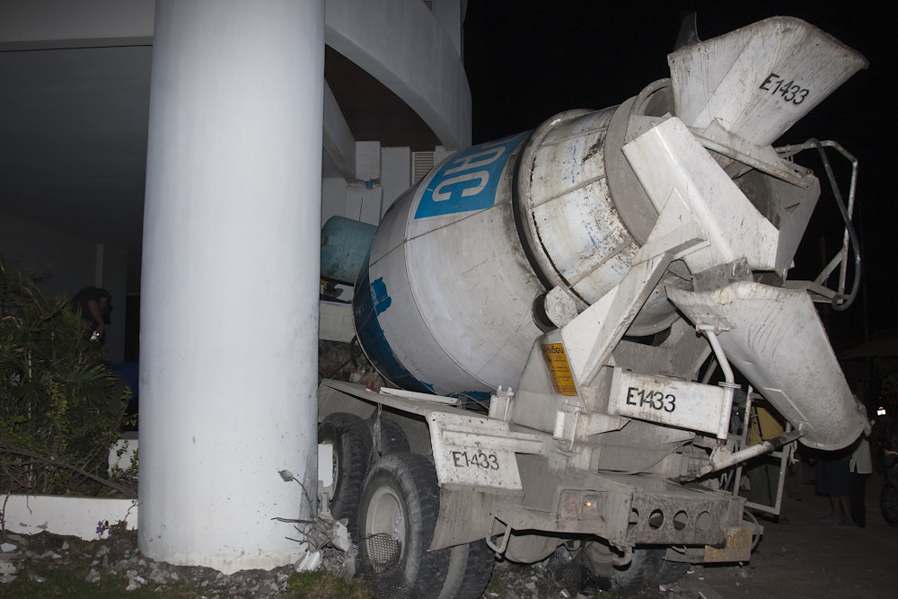 A cement truck has just driven into the condo.
