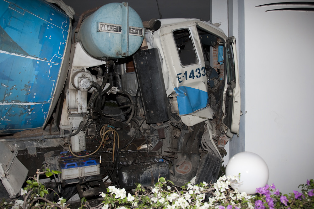 Apparently the brakes had failed on the truck and it had come down the hill at high speed, partially negotiated the corner on two wheels and then plowed into our building. Amazingly, the driver was conscious rather than dead and eventually he was extracted. The ambulance was just taking him away when I took this: