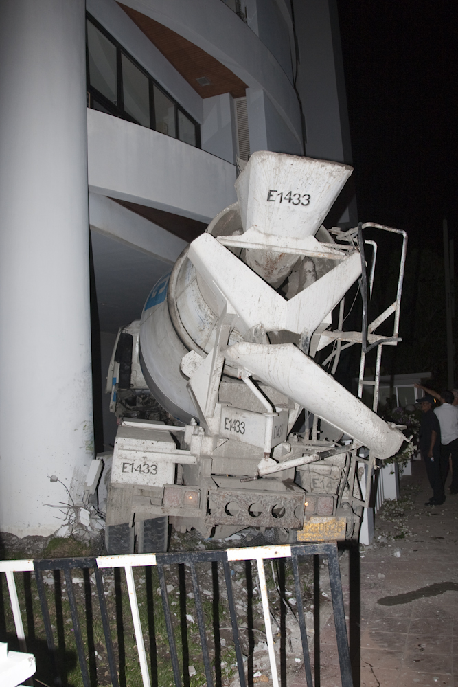 She who must be obeyed was initially concerned that the building would fall down, then she was concerned that the cement truck would explode (a reasonable concern given all the dickheads wandering around the wreck smoking cigarettes); but she was eventually lured back inside with the promise of cakes.