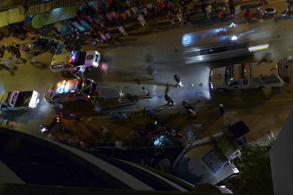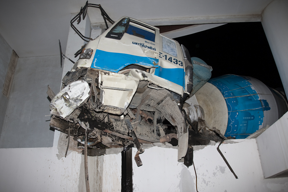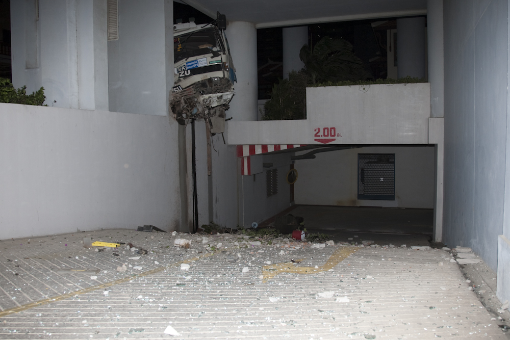 Apparently the brakes had failed on the truck and it had come down the hill at high speed, partially negotiated the corner on two wheels and then plowed into our building. Amazingly, the driver was conscious rather than dead and eventually he was extracted. The ambulance was just taking him away when I took this: