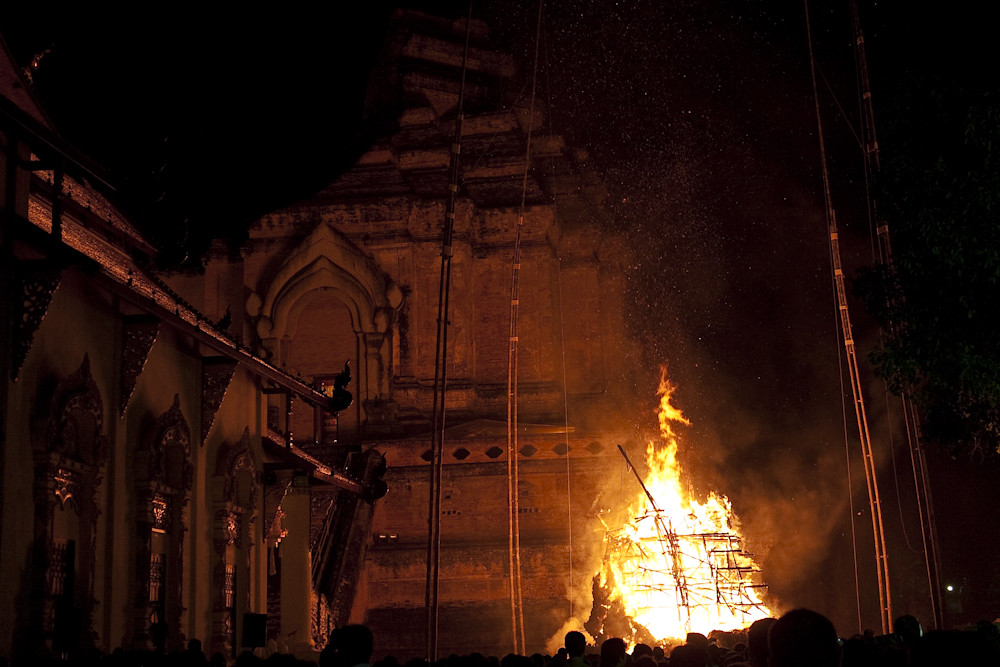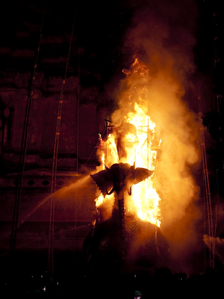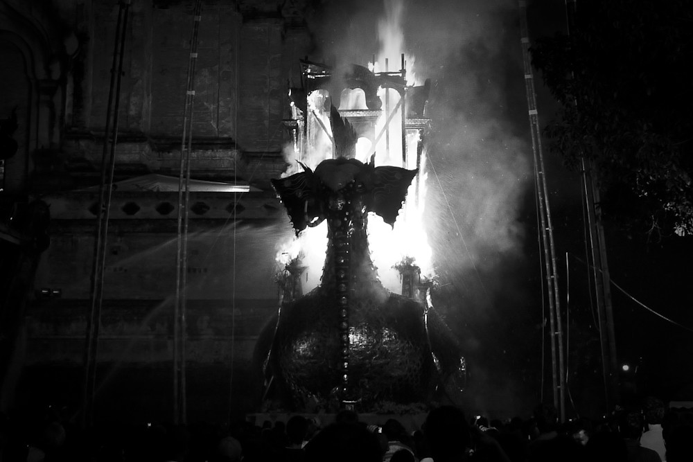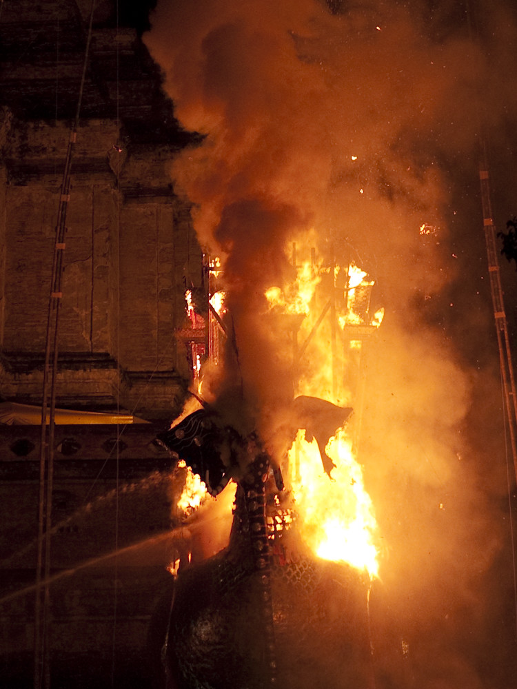 We then discovered that the actual cremation was to be the following evening; 2100 we were told. So at 2030 we headed in the direction of the temple, only to be met by a wave of humanity exiting the temple gates. Luckily there was still something left to photograph: