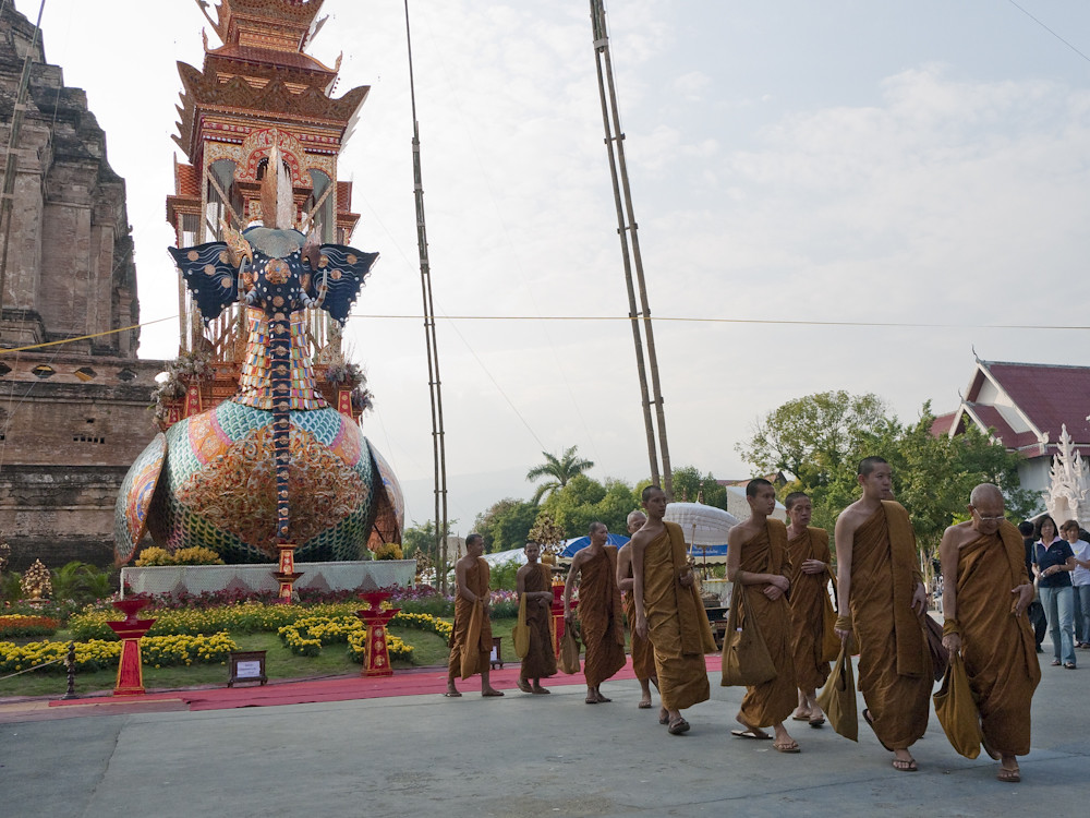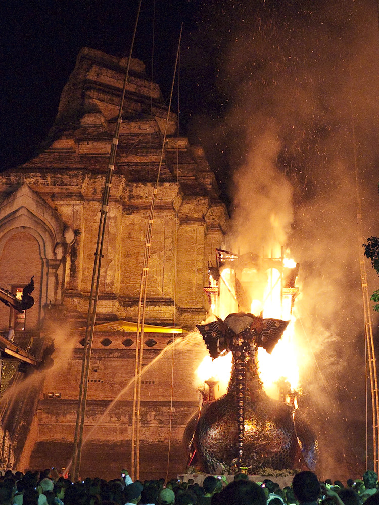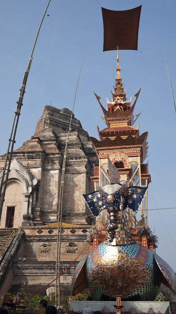 The flying elephant construction was a funeral pyre for the monk shown in the first photo. I turned to my cultural adviser (SWMBO) who told me that he was the top monk in Changmai, much admired by local residents and the royal family, who would be sending Princess Sirindhorn to the funeral. I also learned that he had died more than a year ago, such is the time required to prepare for these events. She also told me his name but I forgot; sorry.
