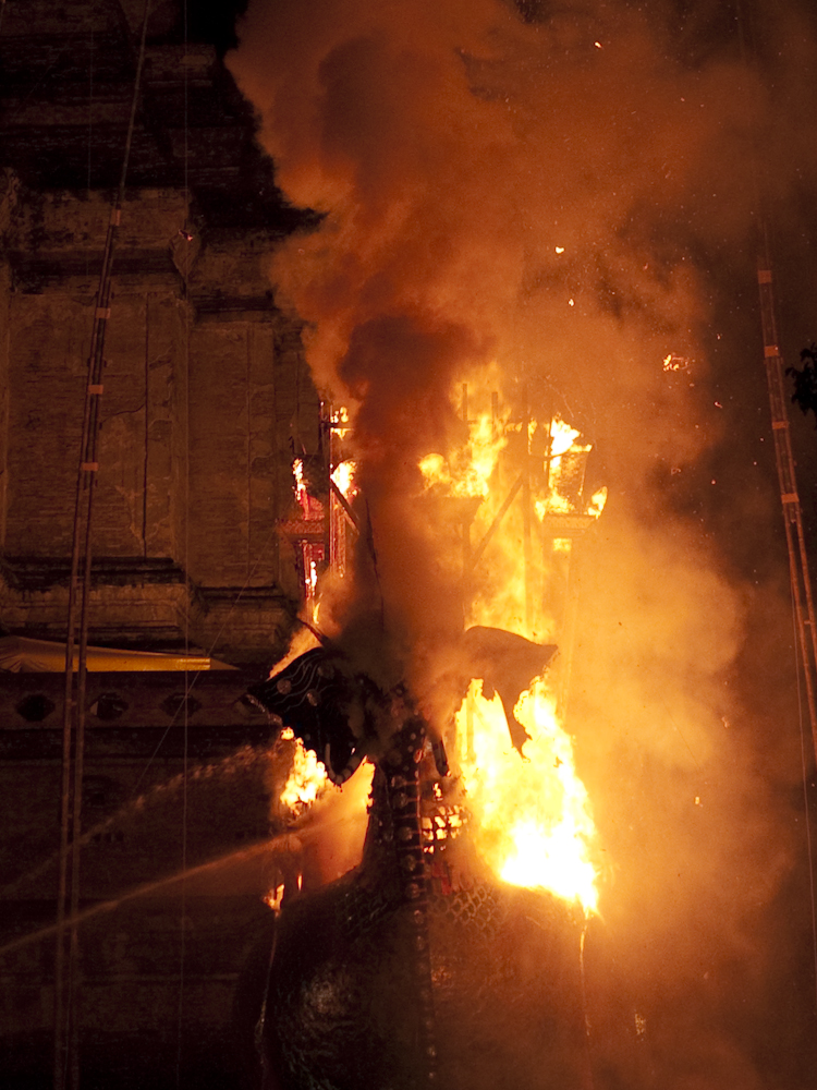We then discovered that the actual cremation was to be the following evening; 2100 we were told. So at 2030 we headed in the direction of the temple, only to be met by a wave of humanity exiting the temple gates. Luckily there was still something left to photograph: