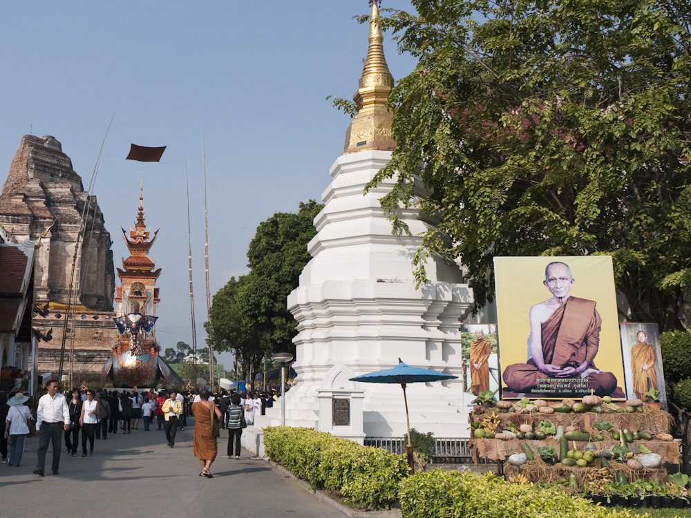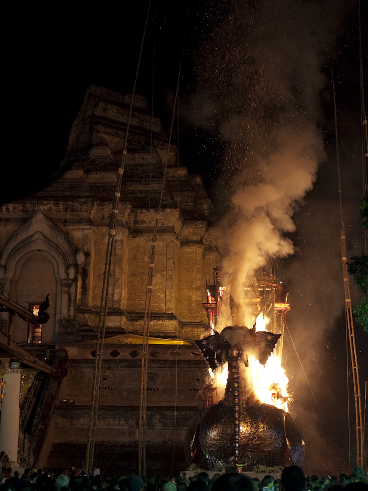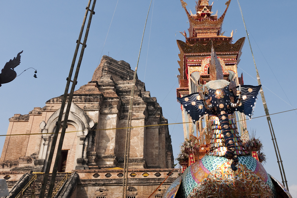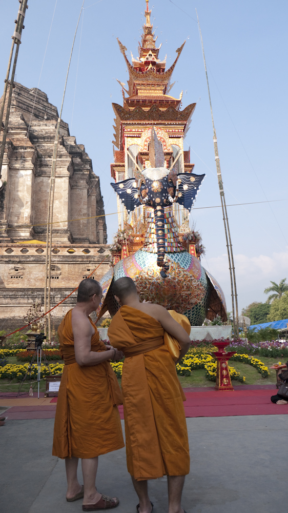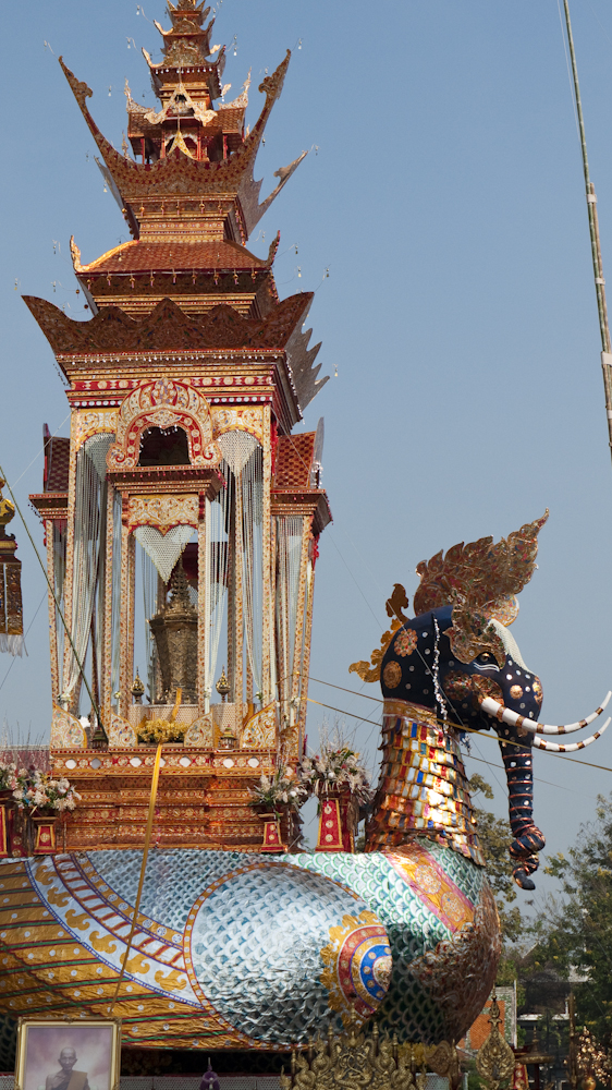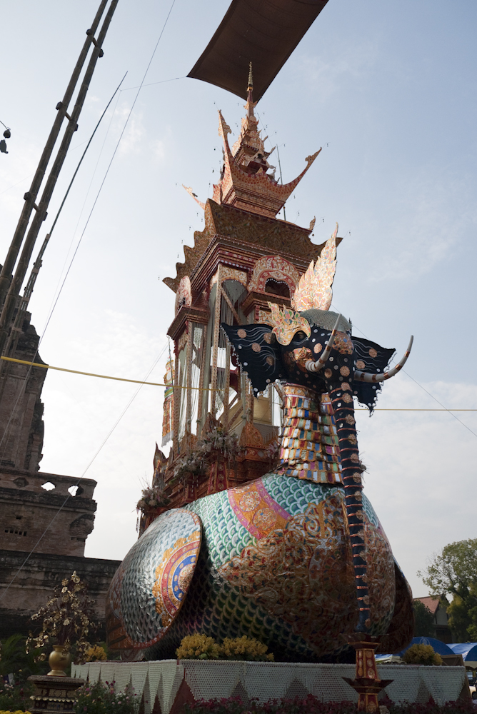 The flying elephant construction was a funeral pyre for the monk shown in the first photo. I turned to my cultural adviser (SWMBO) who told me that he was the top monk in Changmai, much admired by local residents and the royal family, who would be sending Princess Sirindhorn to the funeral. I also learned that he had died more than a year ago, such is the time required to prepare for these events. She also told me his name but I forgot; sorry.