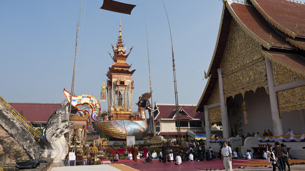 The pyre was an impressive sight, and they had even built in a degree of animation. Yellow tapes extended out on both sides into temple buildings, and unseen hands were pulling the them to flap the wings and move the elephant head and trunk; amazing Thailand indeed.