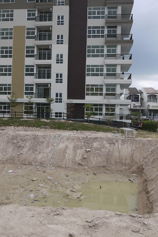 And now, it is a reality. Maybe not looking quite as smart as the graphic is the sales pitch; and there is a slight discrepancy from the plan; instead of two blocks there is only one, but with the added bonus of an huge hole which will make for a great, if muddy, swimming pool once the rains come. Get your wallet out now, there is a chance there might still be some units for sale.