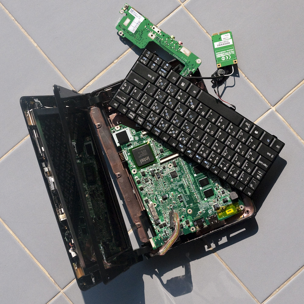Here are some more facts: Netbooks do not come to pieces as easily as a desktop computer. A hammer is never a good idea (this applies to almost everything, especially delivering babies). If you have to prise it open with a screwdriver, there is probably a screw you should have removed first. If you have to prise it open with a screwdriver and something snaps, there is definitely a screw you should have removed first. Once you have taken a netbook to pieces, you can’t put it together again.