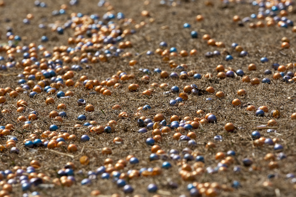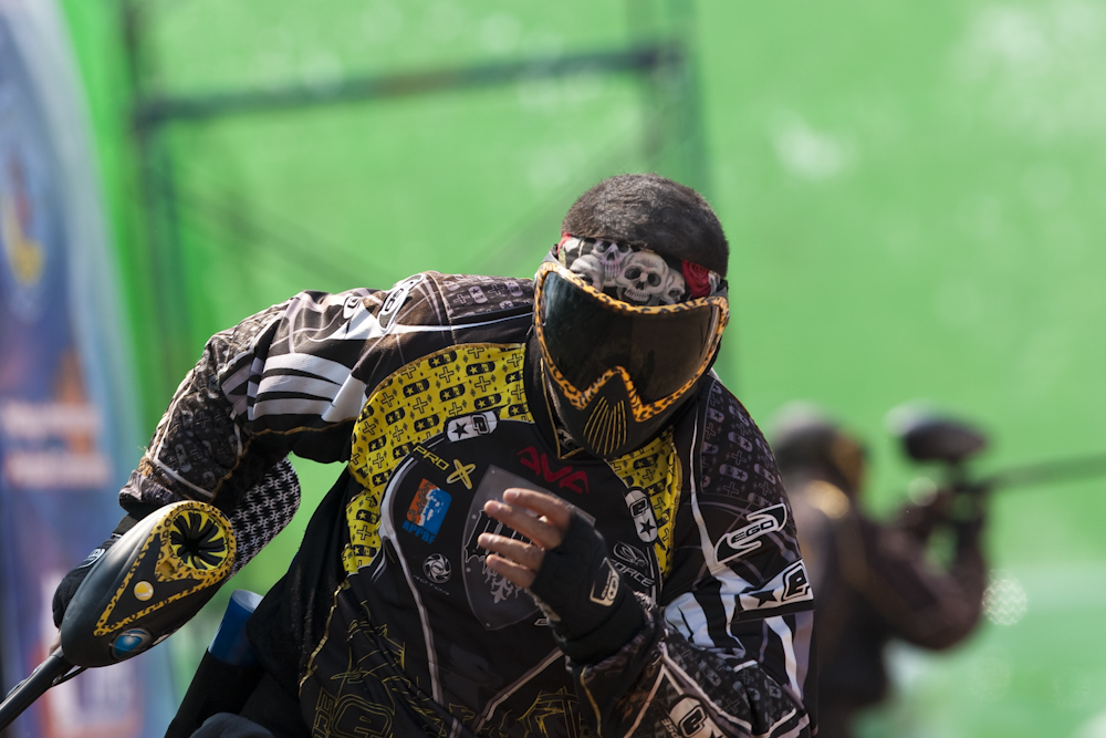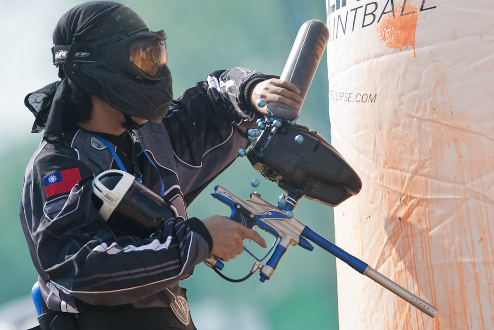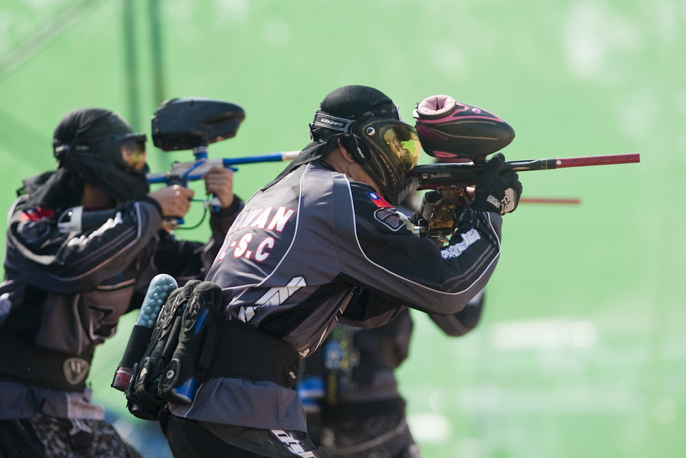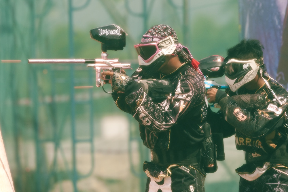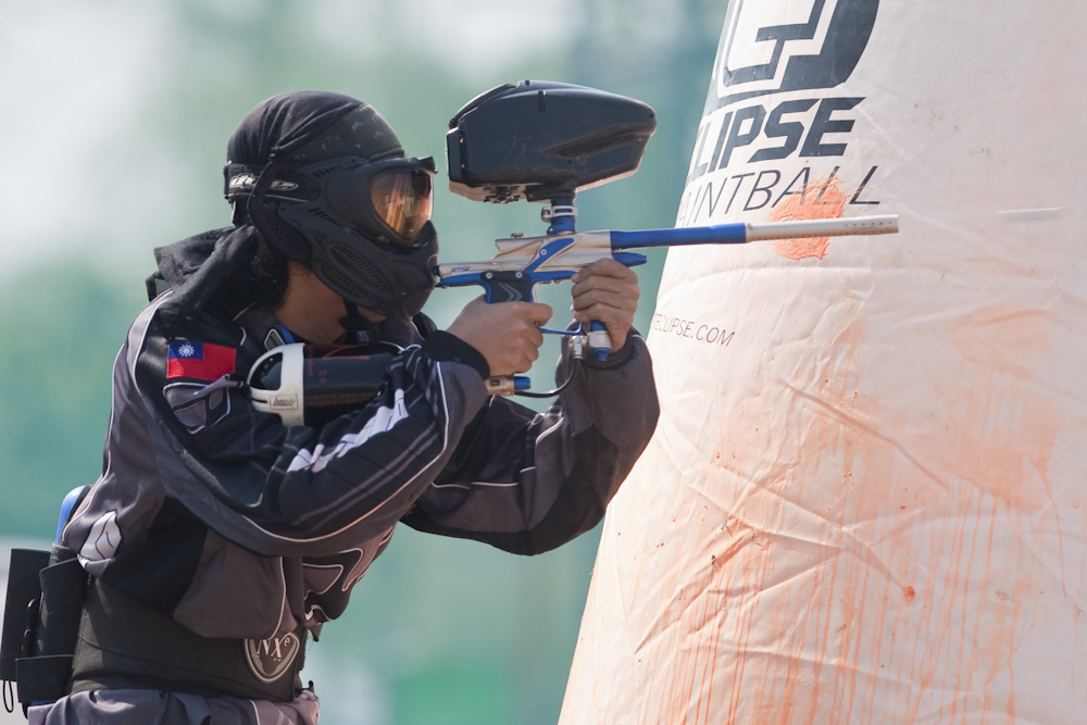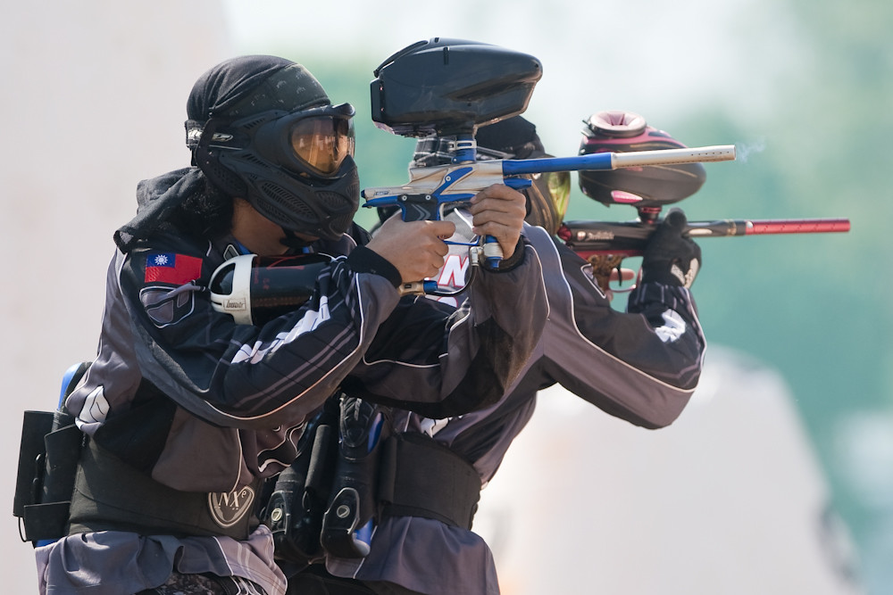 (The streaks coming out of the front of the guns are the paint balls. This was taken at 1/800th of a second, so I am sure one of my intelligent readers could estimate the muzzle speed. Or you could do what I did and look it up, about 320 kph).