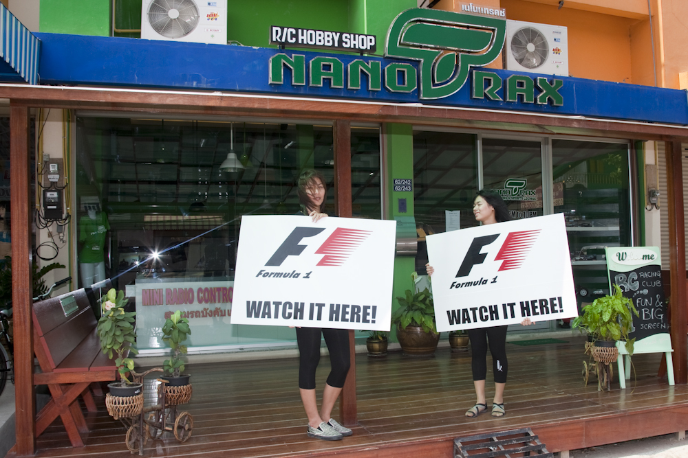 The always enterprising Qon had hired a couple of young ladies to stand outside his establishment holding placards. Instead of the usual adverts for happy hours and cheap beer, they were offering F1. So I could not refuse.
