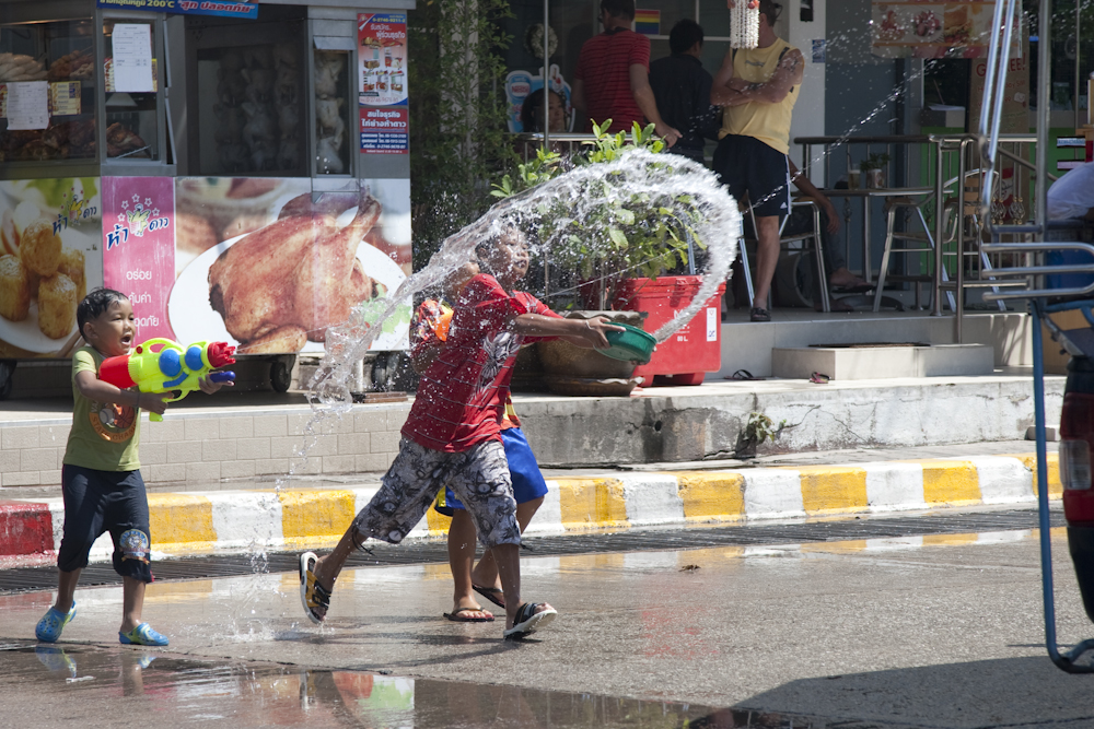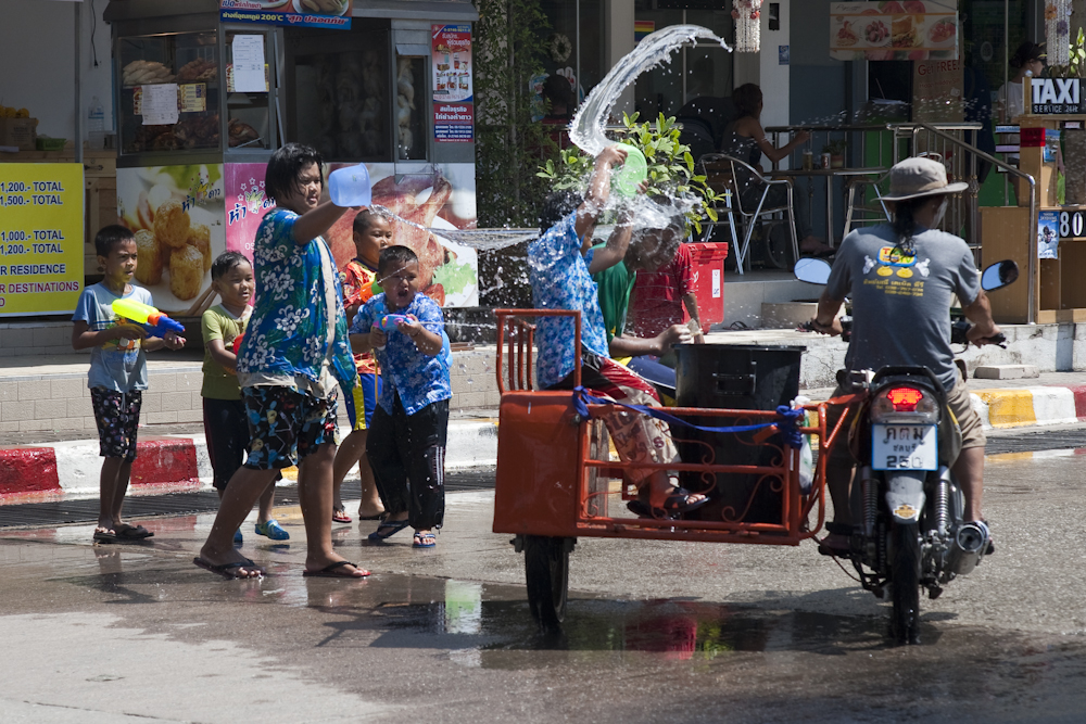 Same for adults. I had a little drive around this morning when things were quiet, and snapped the above. Then, late in the afternoon, we went down to beach road to join in the “fun”. Needless to say I was soaked and covered in sticky talcum powder in minutes, but it was all good-natured and enjoyable in a masochistic sort of way. Around 1800 we headed for home, normally a ten minute journey. This evening it took us three hours, two of which were spent travelling no more than 50 metres on Pattaya Klang. We would still be there now if it was not for one of she who must be obeyed’s demon shortcuts. Normally these end up in a field or a dead end, but tonight she came good.