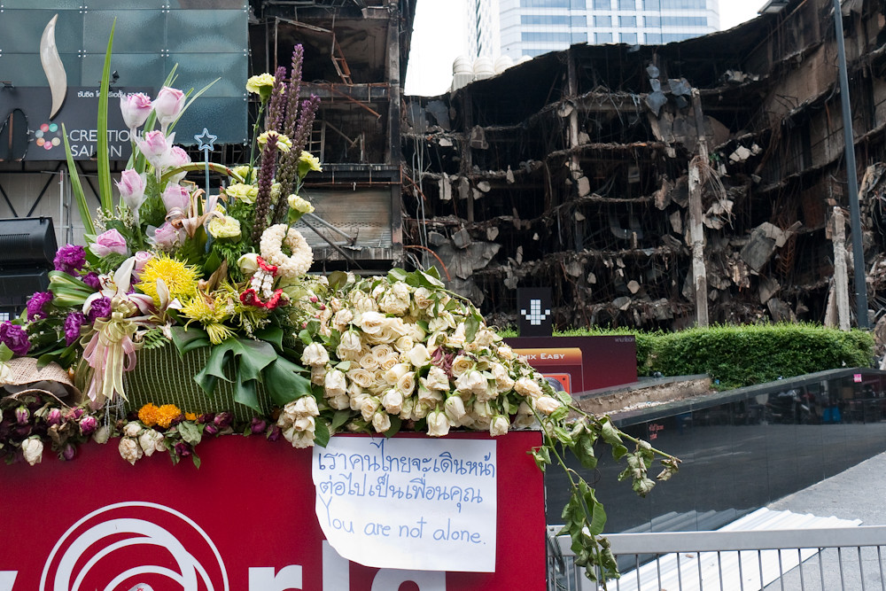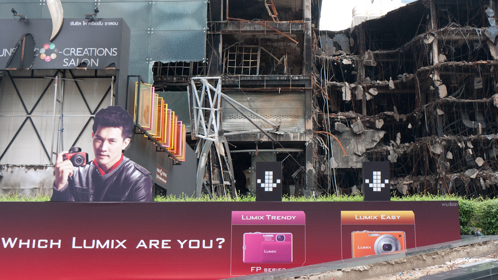 Decide to pop into Panthip and spend a fruitless hour trying to track down a copy of Red Dead Redemption, the latest and greatest from Rockstar Games. No luck, but my journey does take me past Central World where I take a few shots. Rather depressing, but it’s only a building and can be replaced, unlike the 80+ people who died.
