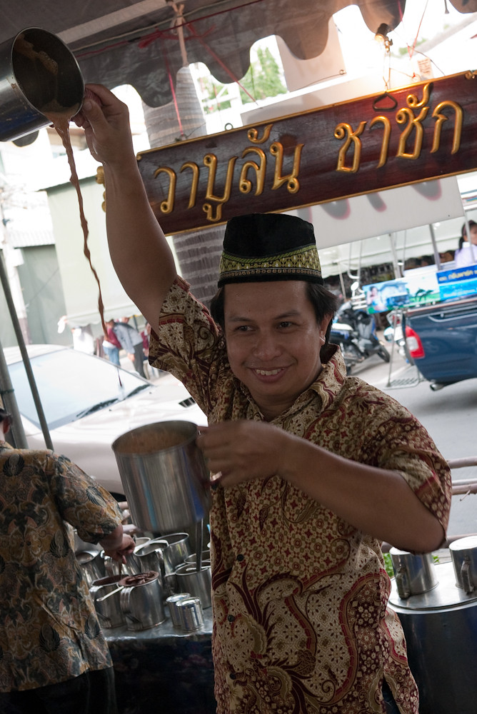 2010-06-06| Pete saysThe sign behind him says (to me) Cha Chak. I’m from Yorkshire and we take our u’s seriously. The big red thing you get on to go somewhere is a bus, not a bas. These two Thai vowels tend to get transliterated wrongly in my opinion, and that one over the top of the letters is an ‘ah’ sound and not an ‘uh’ sound. ชาชัก is what the sign says, meaning tea (drawn, pulled, convulsed). The ‘uh’ ones go under the letters which would be ชาชุก, meaning ‘abundant tea’.