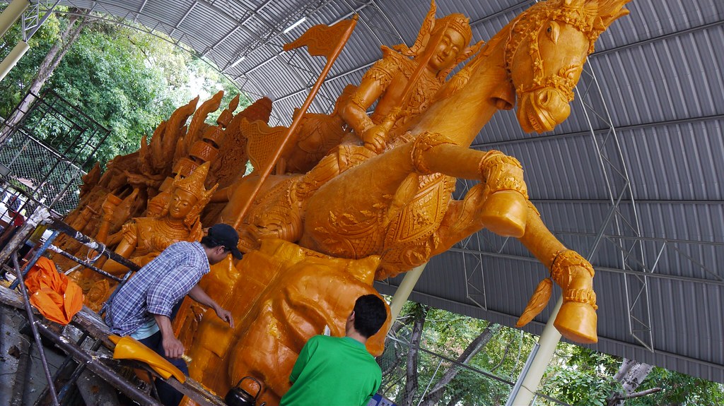 The Ubon candle festival features a competition between temples in the region. You can imagine that the first competition was won by a single decorative candle carried by a monk. Then one temple had the idea of enhancing their candle with a tiny statue, and then the whole thing got out of hand; and now the winning entries need to be towed by a lorry, like this one: