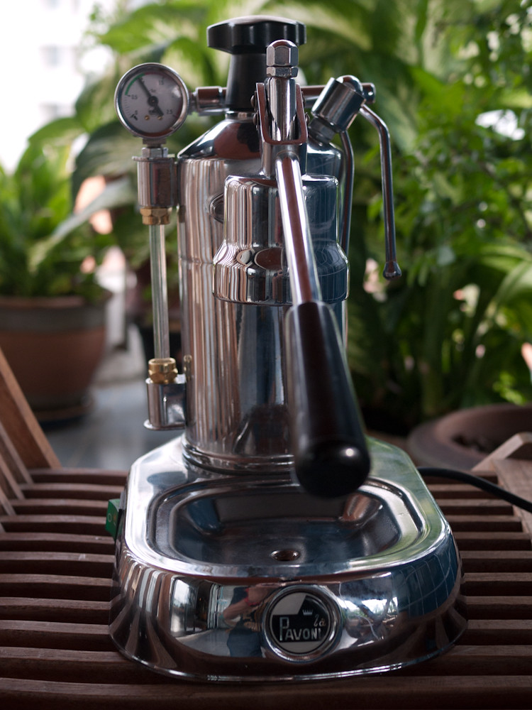 The remaining parts arrived today, and I will admit to slight concern when I turned the beast on again for a pressure test; to the extent that the machine was on the balcony and I made sure that I wasn’t. I waited for the normal hissing and popping which is so much part of the personality of my chrome peacock; but there was no sound. Was it broken? No, the pressure was there, but all the leaks had been fixed by my most excellent craftsmanship and hammering. No one more amazed than me, apart from she who must be obeyed who was cowering in the back room, convinced that a major explosion was imminent.