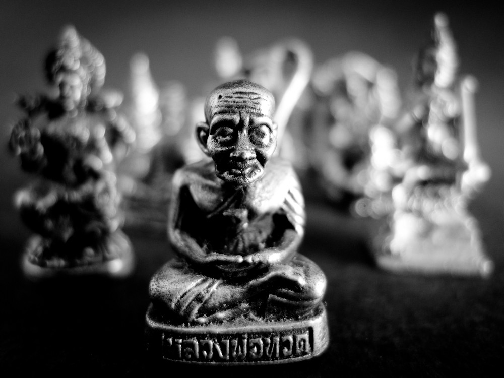 So, no macro, but I could offer him my LX3 which takes stupidly excellent macros, even though it did not originate from a tractor factory. After a couple of hours he returned it, suitably impressed, and it seemed a shame not to point it at something. A rummage in a drawer revealed a bag of tiny Buddhist statues, the purpose of which was not clear, but they could be photographed.