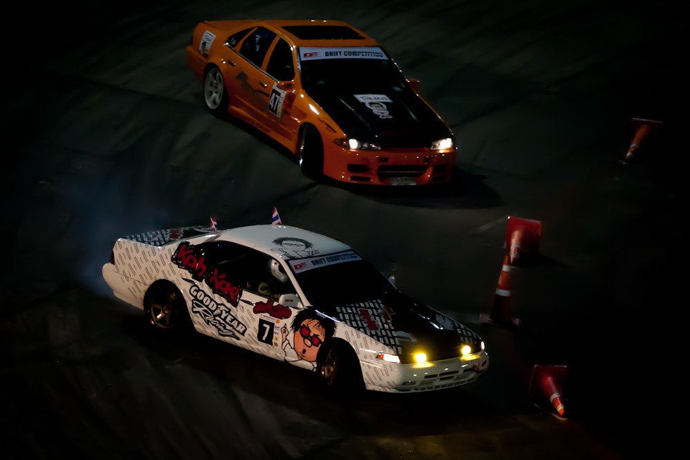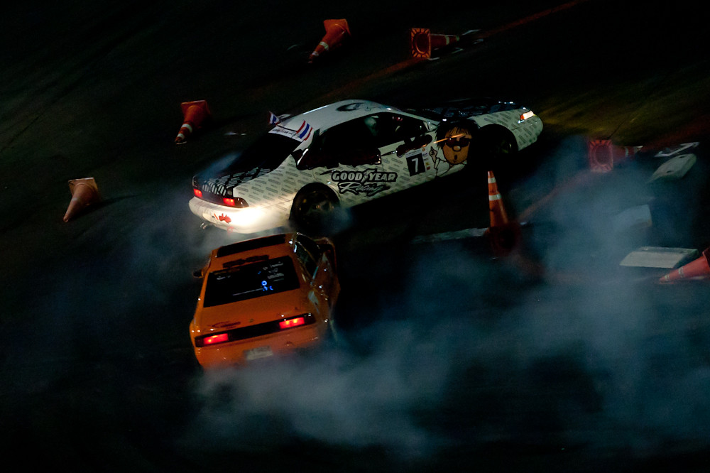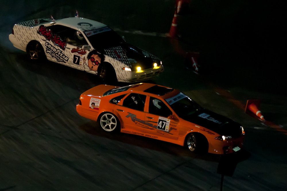 After a delay of twenty minutes, two cars head off in staggered formation round a tight track. The distance between start and finish is around two hundred metres and each race is over in seconds. The drifting is quite impressive however, as is the sound of valves being destroyed as engines are massively over-revved. I expect that vast sums of cash are spent on these smoking, sliding machines. As I lifted $10,000 worth of camera equipment to my eye, I wondered why people are stupid enough to spend so much cash on their hobbies.