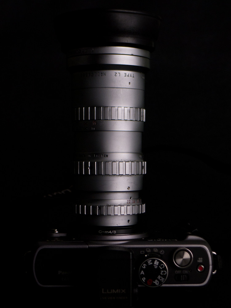 The lens belongs to William, owner of a couple of the lenses featured in the micro four-thirds collection; and the owner of several more tasty pieces of glass following an extended and expensive session on eBay. But this lens in particular was so pretty. Being phallic, of course it has to be French, and it is a cine lens made by Angenieux of Paris.
