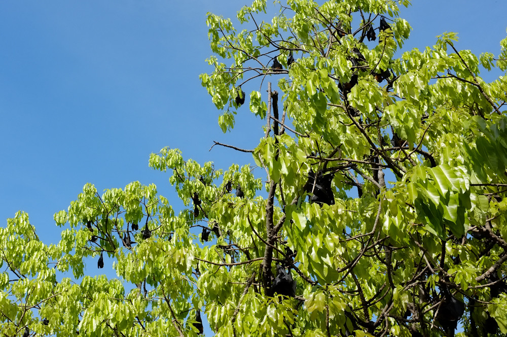 Closer inspection revealed the fruit to be fruit bats. Unfortunately our arrival, although early by my slothful standards, was late enough to make the sky very bright against the dark of the bats in the trees. Still, I got a few shots: