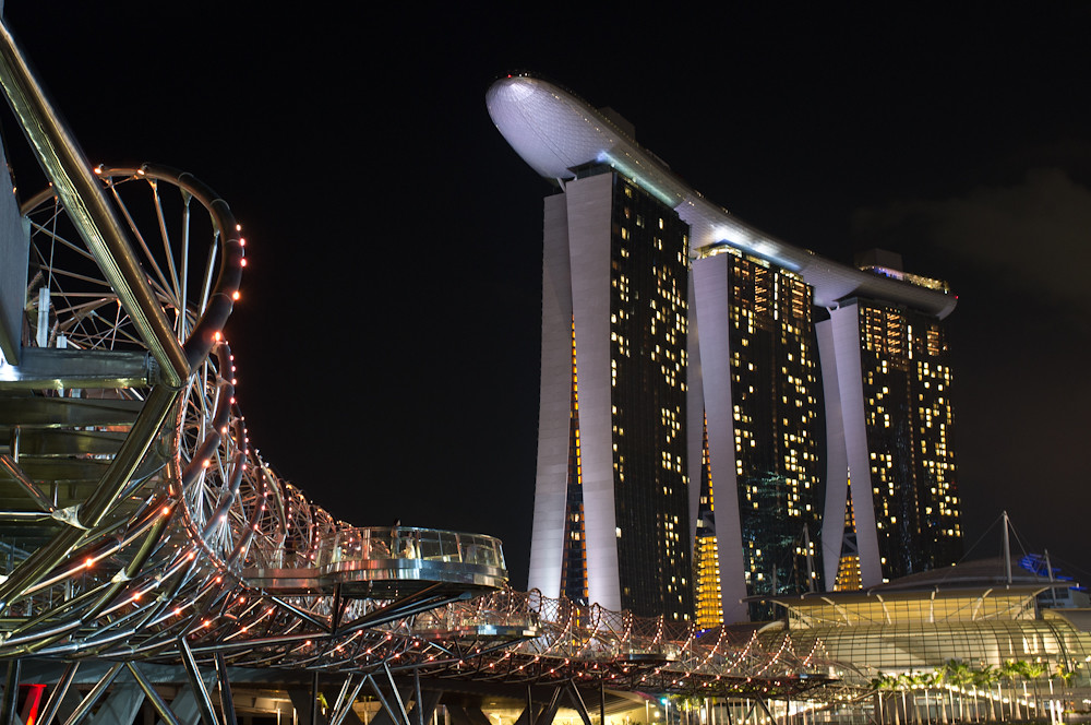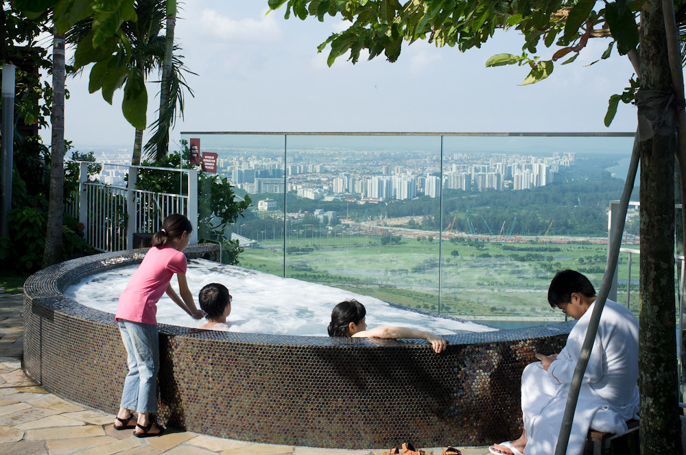 The resort features a 2,561-room hotel, a 1,300,000 square foot convention-exhibition centre, the 800,000 square foot The Shoppes at Marina Bay Sands mall, an iconic ArtScience museum, two large theatres, seven “celebrity chef” restaurants, two floating Crystal Pavilions, an ice skating rink, and the world’s largest atrium casino with 500 tables and 1,600 slot machines. The complex is topped by a 340m-long SkyPark with a capacity of 3,900 people and a 150m infinity swimming pool, set on top of the world’s largest public cantilevered platform, which overhangs the north tower by 67m.