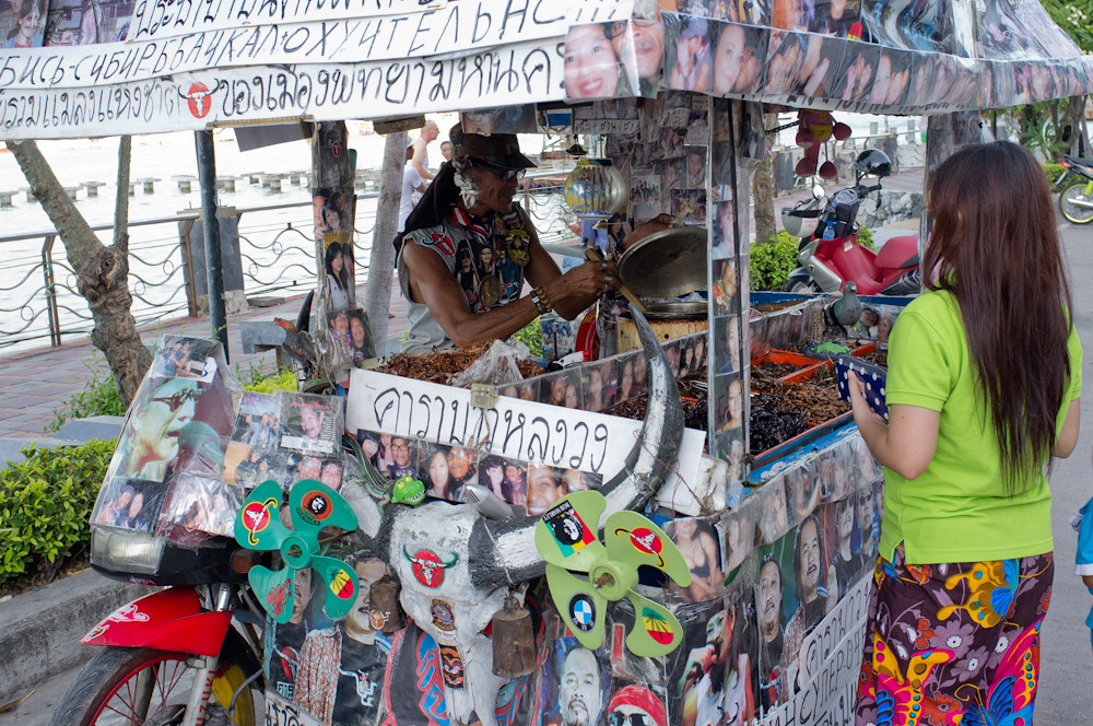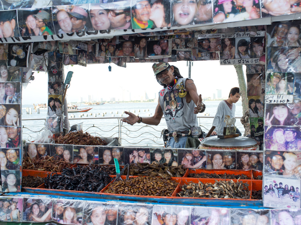 He sells fried insects, so his non-Thai customers are probably few, but he always has a big smile and a pose for the camera.