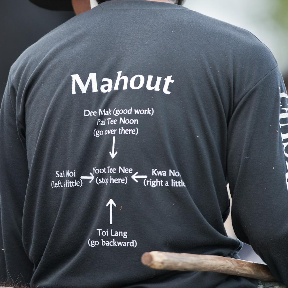 Each elephant was controlled by a mahout, and it was up to the player to communicate directional changes to him. For those who didn’t speak Thai, there was a helpful guide on the back of each T-shirt.