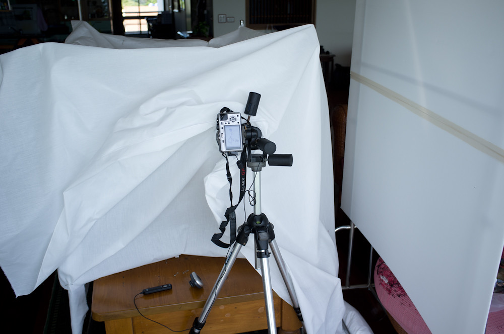 Of course, once I took some photos, there were reflections, this time of the brightest part of the cloth next to the window. So I closed the windows which are slightly smoked, a little better. So I draped some more cloth over the front and the patch almost went away, although there was still a black blob reflected the camera lens. But a bit of Photoshop would say goodbye to that.